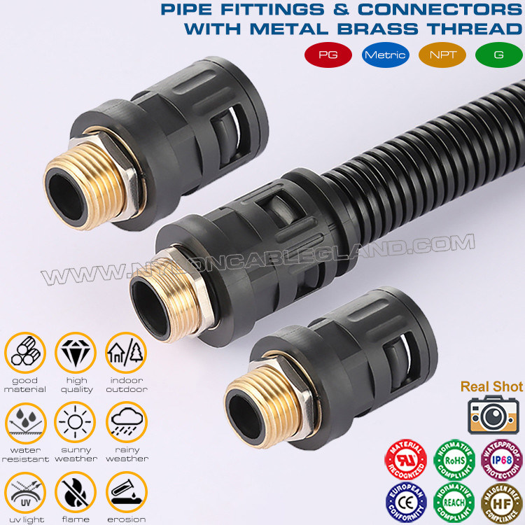 نایلون 6 کانکتور مستقیم (اتصالات لوله) مشکی RAL9005 c/w رزوه فلزی PG7~PG48 برای لوله های راه راه AD7~AD108 نوعی دستگاه اتصال است که به طور گسترده در سیستم های تحویل برق، مایع و گاز استفاده می شود. عملکرد آب بندی بالایی دارد و به طور ویژه برای اتصال لوله های موجدار استفاده می شود. این می تواند اتصالات ایمن و قابل اعتماد را در طول حمل و نقل مایعات یا گازهای با دمای بالا، فشار بالا و خورنده حفظ کند.