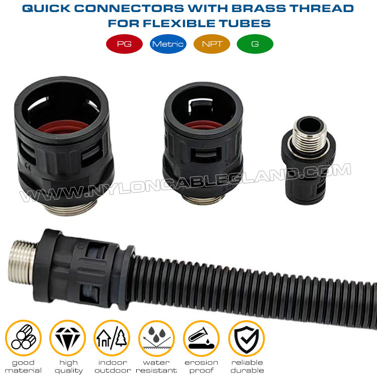| نام محصول: | نایلون 6 کانکتورهای سریع (مفاصل) مشکی RAL9005 با رزوه فلزی PG7~PG48 برای لوله های راه راه AD7~AD108 |