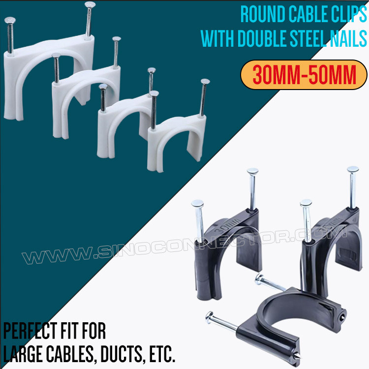 بست کابل گرد با یک میخ سیمانی یا دو میخ سیمانی برای محکم کردن و سازماندهی سیم ها، کابل ها یا لوله های بلند روی یک سطح، مرتب و منظم نگه داشتن آنها، محافظت از آنها در برابر آسیب و جلوگیری از خطرات سفر استفاده می شود. به طور معمول آنها در مواد پلی اتیلن (پلی اتیلن)، رنگ های مختلف و اندازه های مختلف برای قرار دادن انواع و مقادیر مختلف سیم، کابل یا لوله در دسترس هستند. گیره های سیم کابل معمولاً به عنوان دستگاه های کوچک و محکمی طراحی می شوند که می توانند به سطحی مانند دیوار، میز یا سایر سازه ها متصل شوند. آنها یک کانال مرکزی یا دهانه ای دارند که کابل را می توان در آن وارد کرد.