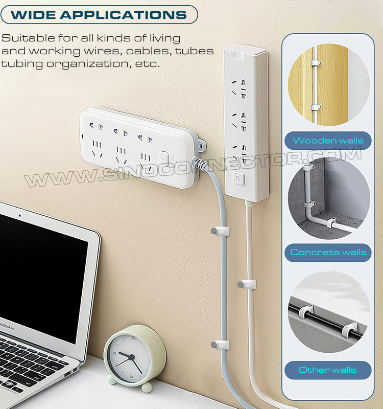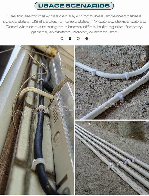 چنین نگهدارندههای کابل یا سازماندهندههای کابل برای کابل کواکسیال RG8X، RG58، RG59 یا LMR 240، کابل کواکسیال ویدیو یا صوتی دیجیتال RG6، Ethernet Cat 5، کابل شبکه Cat 6، سیم بلندگو، سیم تلفن، کابل USB، چراغ کریسمس و غیره مناسب هستند. خانه خود را مرتب تر کنید و فضای زیادی آزاد کنید. تمیز کردن کابل همچنین می تواند ایمنی استفاده از برق را بهبود بخشد و از ایمنی اعضای خانواده به ویژه کودکان محافظت کند.