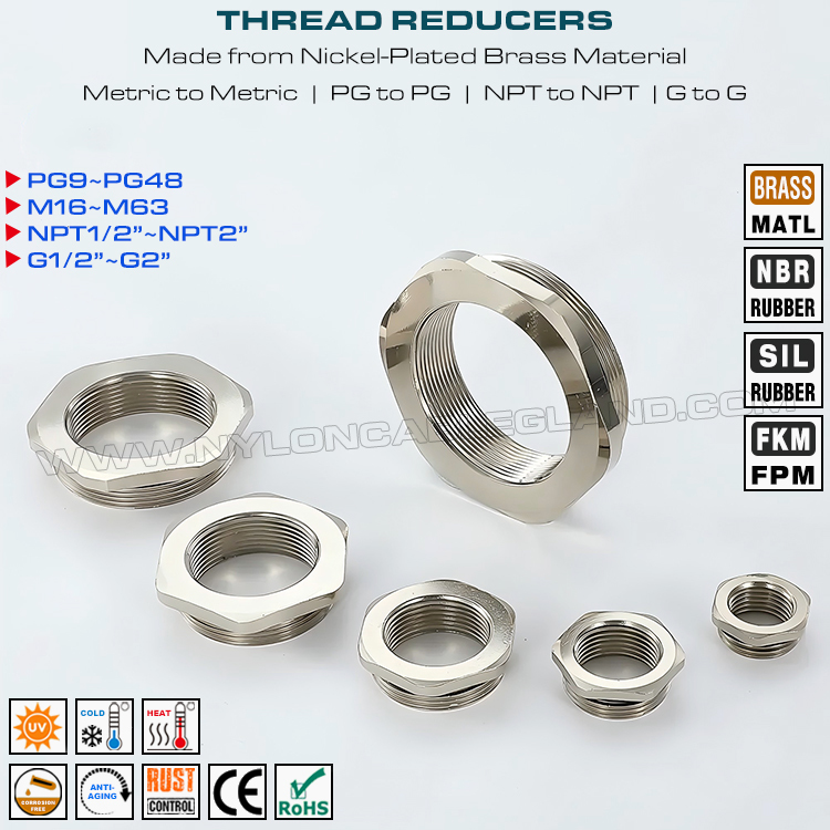 ساخته شده از برنج یا فولاد ضد زنگ 304، 316 یا 316L، اتصالات استاندارد جدیدی هستند که برای کاهش، بزرگ کردن یا تطبیق اندازه های نخ استفاده می شوند، آنها با نوع گرد یا شش ضلعی طراحی شده اند و در مجموعه ای از اندازه های استاندارد موجود هستند. رزوه های با اندازه یکسان یا کوچکتر را به سوراخ های خالی اضافه کنید، سوراخ های رزوه ای را برای اندازه های مختلف یا سیستم واحد تطبیق دهید، آنها یک روش اتصال مستقیم و قابل اعتماد بین غدد و رزوه های کوچکتر را ارائه می دهند.