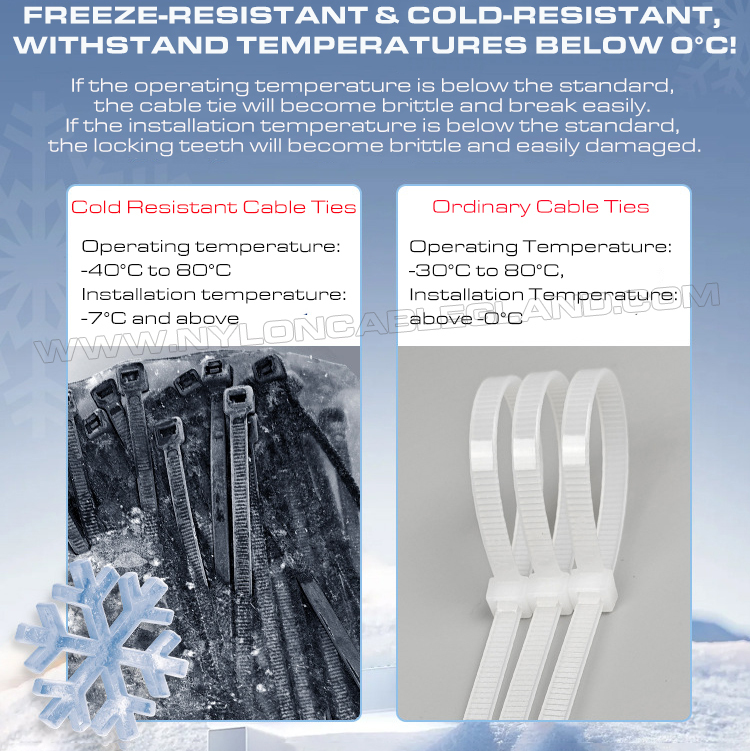 بست کمربندی کابل مقاوم در برابر دمای پایین (همچنین به عنوان عدد بست کابلی مقاوم در برابر یخزدگی یا بست های کابلی مقاوم در برابر سرما شناخته میشوند) بستهای کابلی نایلونی هستند که برای محیطهای سرد طراحی شدهاند. آنها از مواد نایلونی مخصوص مقاوم در برابر دمای پایین (مانند مواد اصلاح شده PA6.6) ساخته شدهاند. مزایای آنها شامل مقاومت عالی در برابر ضربه سرما (مقاومت در برابر شکستگی شکننده)، استحکام بالا، مقاومت در برابر سایش بالا، پایداری ابعادی خوب و مقاومت شیمیایی و خواص الکتریکی عالی است. آنها میتوانند استحکام، چقرمگی و مقاومت در برابر شکنندگی خود را در دماهای بسیار پایین (مانند -40 درجه سانتیگراد) پایینتر از نایلون استاندارد حفظ کنند. آنها به طور ویژه برای تعمیر تجهیزات در مناطق سردسیر یا در زمینههای صنعتی که نیاز به عملکرد مواد در دمای پایین دارند تا از محکم و ایمن بودن اقلام اطمینان حاصل شود، استفاده میشوند.